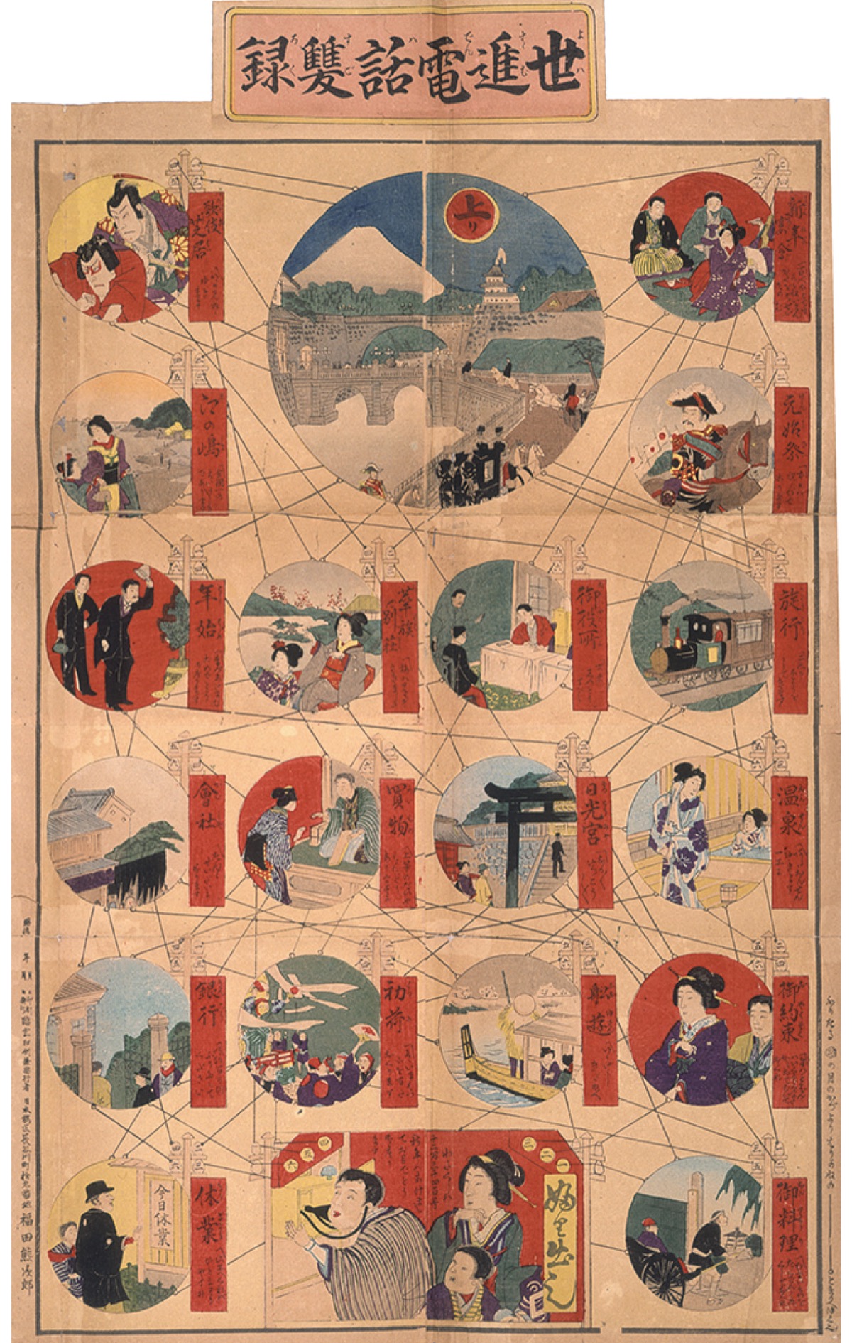 企画コーナーでは明治時代の絵双六を紹介。明治天皇の東京行幸を描いた歌川国輝『東海道五拾三次大寿語六』、日本の名所とともにニューヨークやロンドンなど世界各地を巡る尾関トヨ『万国名所寿語録』、電話開通をテーマとした三代歌川国貞『世進電話双六』などが展示されている。