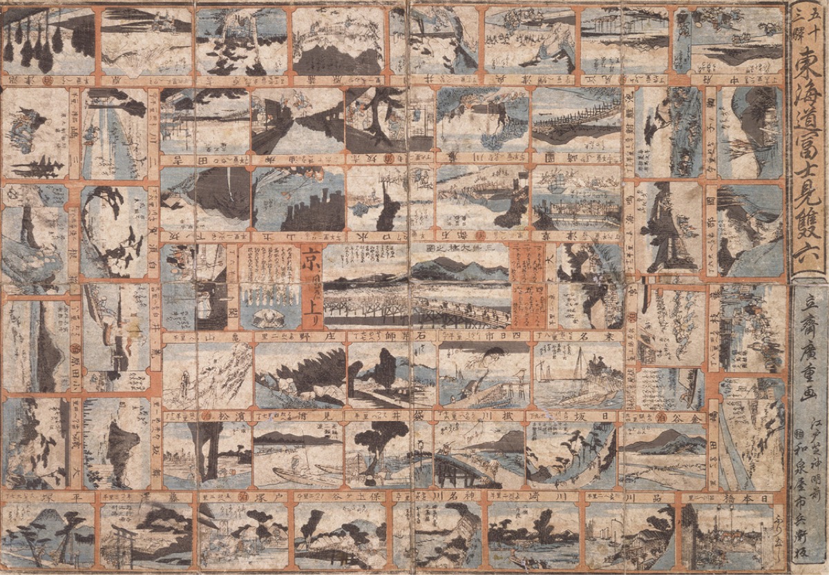 東海道コーナーでは、当時の東海道各宿場の名物が紹介されている初代歌川広重『東海道遊歴双六』や、江戸庶民の一生を教訓とともに辿る歌川国郷『教訓人間一生道中双六』などが展示されている。