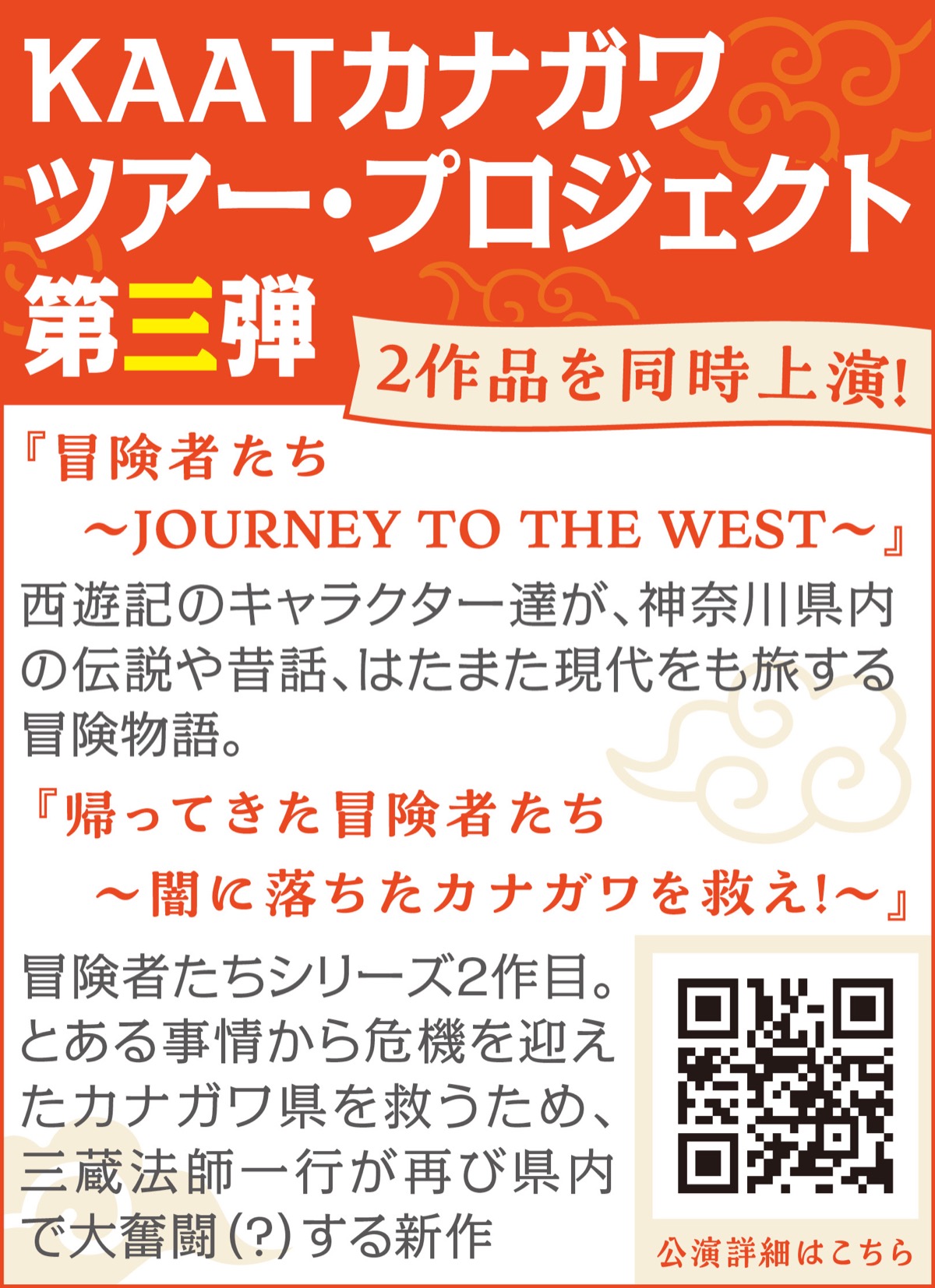 藤沢公演の日程は次の通り。▽『冒険者たち〜JOURNEY TO THE WEST〜』/3月20日(金)午後4時〜▽『帰ってきた冒険者たち〜闇に落ちたカナガワを救え!〜』/3月21日(土)午後3時〜、会場はいずれも藤沢市湘南台文化センター市民シアター