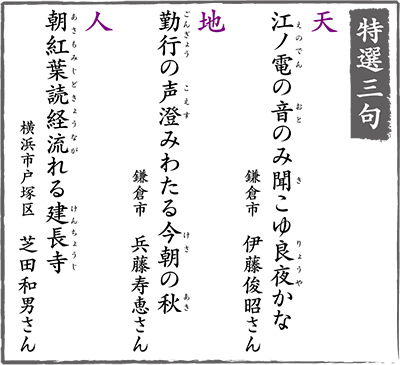 特選句は「天」に「江ノ電の音のみ聞こゆ良夜かな(鎌倉市伊藤俊昭さん)」、「地」に「勤行の声澄みわたる今朝の秋(鎌倉市兵藤寿恵さん)」、「人」に「朝紅葉読経流れる建長寺(横浜市戸塚区芝田和夫さん)」の3句。
