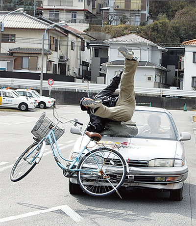 スタントマンが交通事故現場を実演する「スケアードストレート方式」による安全教育が今月2日、市内では初めて、湘南センチュリーモータースクール(鎌倉市台)で行われた。鎌倉市内の小・中学校の教員や保護者、主催した鎌倉市交通安全対策協議会ら約100人が迫力あるスタントマンの実演を見守った。