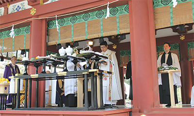 この日、集まった宗教家は約400人。同宮の舞殿では、鶴岡八幡宮の吉田茂穂宮司や、市仏教会会長で覚園寺の仲田昌弘住職、カトリック雪ノ下教会の山口道孝司祭による祈祷や読経が行われ、被災者への祈りが捧げられた。市の内外からの一般参加者も約1万人以上が集まった。