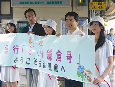 鎌倉の観光シーズンに毎年運行している「ぶらり鎌倉号」が今月11日、震災後初めて運行され、松尾崇鎌倉市長とミス鎌倉がJR鎌倉駅のホームで乗客約200人を出迎えた。同号は福島県のいわき駅から日立駅や水戸駅などを経て鎌倉駅へ向かう臨時急行列車。