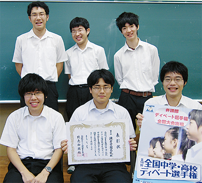 与えられたテーマに対し、肯定と否定に分かれ議論を行うディベート。聴衆を納得させた方が勝者だ。試合は1チーム4人で行う。「事前の準備と、チームワークが大切」と部長の河原伸哉さん(3年)は話す。今大会の議論のテーマは「日本は道州制を導入すべきである。是か非か」。全国大会に向けて6人いる部員全員で協力して準備を進めている。資料を探しながら持論を作り上げ、大会前は夜中の2時まで議論することも。月2回ほど他校と練習試合を行い、技術を磨いている。
