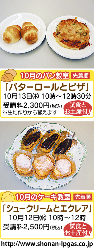 湘南液化ガス(株)では毎月、パンとケーキ教室を開催しています。格安な料金と丁寧な指導が評判で初心者でも気軽に参加できるとあって人気の教室です。生地作りなど、一から教えてもらえる貴重な機会です。