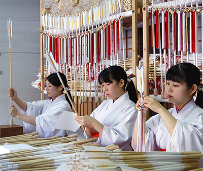 巫女や神職が鏑、和紙、鈴の取り付けを全て手作業で行い、一本の破魔矢を完成させる。