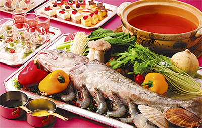 ”魚貝”のイタリア風あったか鍋などのメインの料理から食後の定番のデザートバーまで豊富なメニューが揃う。大人1人3900円で、午前11時30分から午後3時(入場は2時30分)まで。