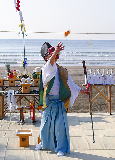 波打ち際から約15mの位置に敷かれた御座の上で、神職により神楽が奉納された。笛や太鼓の音に合わせて舞い、潮騒の中粛々と進められた。