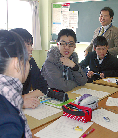 英語の授業では、七里高の生徒がグループに分かれ、そこに台湾の生徒が一人ずつ参加。自己紹介を通して、最後に七里高生徒が英語で「ゲスト」を紹介した。電子辞書片手に、積極的に会話する女子生徒の姿も見られた。