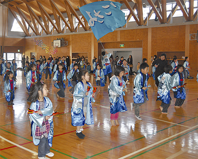 「ソーラン、ソーラン」「よっちょれ、よっちょれ」。子どもたちの元気な掛け声が体育館内に響き渡った。