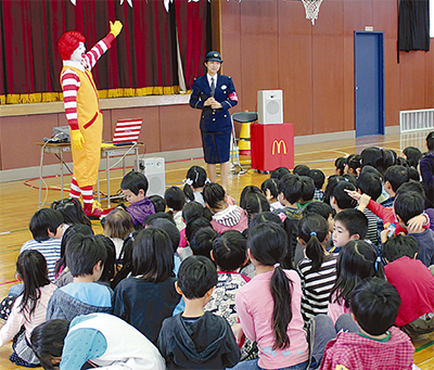 式の前には、この4月に入学したばかりの新1年生116人に対し、同社のキャラクター「ドナルド・マクドナルド」による防犯ワークショップが行われた。