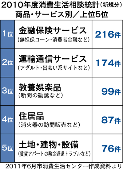 同センターによると寄せられる苦情や相談はひと月に約100件にのぼるという。年代別に見ると2010年度の統計で04年度から10年度まで7年続けて70歳以上が最も多くなっている。