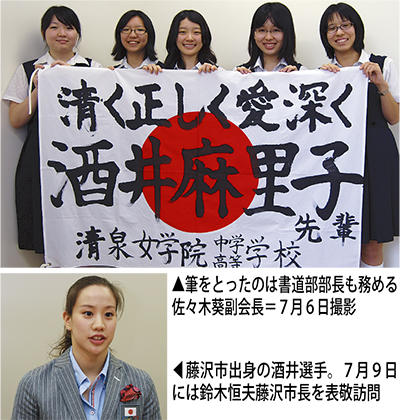 清泉女学院中学高等学校出身の酒井麻里子さん(21)が、シンクロナイズドスイミングで日本代表としてロンドン五輪に出場することを受け、同校生徒が応援旗を作成、7月7日に酒井さんの母親に手渡した。