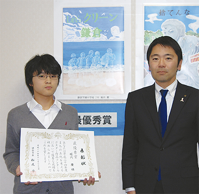 最優秀賞に輝いたのは鎌倉学園中学校3年の堀内慶君。作品は、海岸でゴミ拾いをする人たちを透かして描き、青、白、黄緑色を用いて爽やかな雰囲気を表したもの。堀内君は「『まちをきれいにする』ことを表現するために、人物を透かして描いた。それを見守る、大仏の形をした雲がポイント」と話した。受賞については「初めて最優秀賞を取れて、うれしい」と感想を話した。
