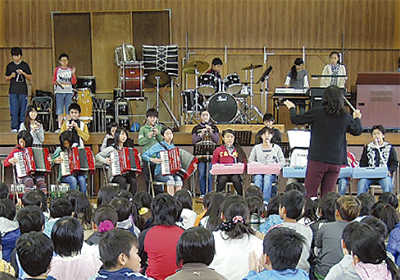 会では5、6年生児童による合唱や合奏、PTAによるコーラス、マリンバの演奏、卒業生らによる和太鼓「ふれあい太鼓」などが披露され、約100人の保護者や同窓生と、404人の児童が、同校の歴史を刻む喜びを共にした。