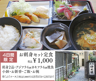 同店では感謝の気持ちを込め、3月4日(月)から8日(金)(7日(木)除く)の昼4日間限定で、通常1570円の「お刺身セット定食」を税込1000円で大奉仕。