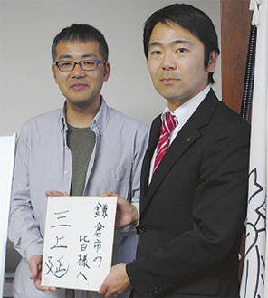 三上さんと松尾市長は歴史ある街並みなど鎌倉の魅力について会談。大船高校出身の三上さんは「北鎌倉には愛着がある。夏目漱石に縁がある円覚寺は特に好きな場所」と話し、松尾市長は「登場人物の栞子(しおりこ)さんが魅力的で惹きこまれる」と作品の感想を話した。