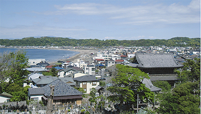 山門の大きな瓦屋根が見えます。その向こうには白波のたつ青い海、砂浜には人影が見えます。強い日差しを浴びた町並み、周辺の木々の新緑も鮮やかです。しばらく眺めていると鎌倉の自然、生活、文化までも感じることができるようです。