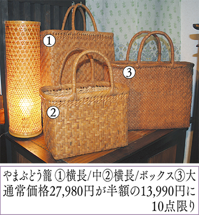 自然素材や手作りの品を取り扱う六地蔵近くの「WABIAN」では、6月6日(木)まで7日間限定でやまぶどう籠10点を半額で提供中(本店のみ)。散策に欠かせない籠は、使えば使うほどなめらかになり、艶が出てくるという。自然素材でもあるので一年中使え、コーディネートの幅が広がる優秀なアイテム。他にもお買い得なくるみ籠など多数ご用意。この機会に試してみては。