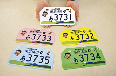 またこうした流れを受け、増えているのが原動機付自転車のご当地ナンバーだ。市区町村の条例に基づく「課税標識」で、デザイン等は自治体が独自に決定できるとあって、07年の愛媛県松山市を皮切りに全国で導入が進む。県内では11年4月に南足柄市で初めて登場した。