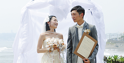 鎌倉でデートを重ねた2人。プロポーズは由比ガ浜の海岸だった。式の舞台に稲村ガ崎の公園を選んだ理由は、学生時代に友人と訪れ「こんな場所で結婚式ができたらかっこいいよね」と話したことが記憶に残っていたからだという。