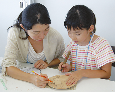 31日は会場に75組の親子が参加。同館職員や親のサポートの下、あじさいやキリン、アニメのキャラクターなど思い思いにデザインした図案を、約3時間かけて直径17cmの木皿に彫刻刀で刻んでいった。