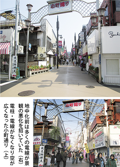 景観の保全や歩行空間のバリアフリー化、避難路確保などの防災対策などの理由から国が2004年度に「無電柱化推進計画」を策定。市はこれに基づき、鎌倉の玄関口・小町通りの「地中化事業」に着手。05年度に方針を決定し、07年度に試掘調査。08年度から本格的に着工し、12年度中に電線地中化が完成した。今年度は舗装や景観舗装工事を行っていた。工事は当初11年度中までの予定だったが、東日本大震災の影響などで完成が遅れていた。