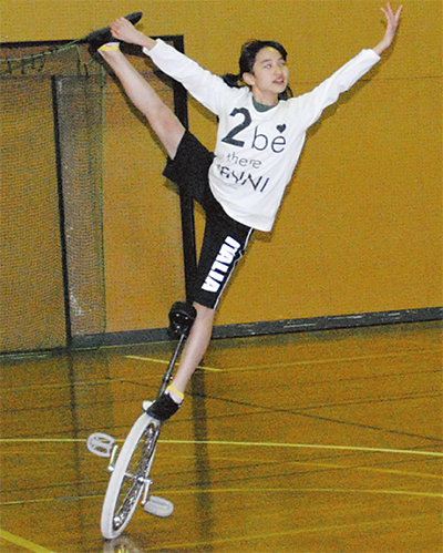 一輪車の醍醐味を「練習して技ができるようになった時の嬉しさ」と話す橋本さん。現在、習得を目指しているのは「『バックぴょん立ち』からバックターン」。背走しながら、フレーム部に両足で飛び乗りターンする難技だ。演技の流れの中で決めることはさらに難しく、思い切りの良さとバランス感覚が問われるという。
