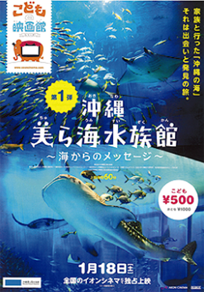 第1弾は『沖縄美ら海水族館〜海からのメッセージ』。内容は、水族館を舞台に飼育員の父とその家族を描いた物語。大画面で魚たちが縦横無尽に動き回る映像は、まるで動く図鑑を見ているようで、子どもたちの知的好奇心をくすぐる。60分と通常より短い上映時間や館内の明るさ、音量にも配慮。少し位騒いでも平気だという。2歳以上中学生以下500円。高校生以上は1000円。