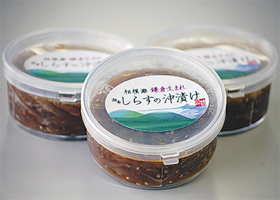 しらすの沖漬けは、採れたてのしらすを船上(沖)でタレに漬け込み、日持ちの良さと深い味わいを実現したもの。市内岡本で料理教室「鎌倉ダイニング」を主宰する矢野ふき子さん(=人物風土記で紹介)が開発した。きっかけは3年前、テレビ番組の取材で「漁師の朝ごはんに合うメニューを作ってほしい」とリクエストされたことだった。
