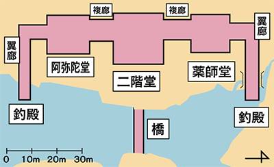 発掘調査の結果、中央に「二階堂」、両脇には「阿弥陀堂」「薬師堂」があり、三つの堂が東を向き、南北一列に並ぶ独特の配置だったことが判明した。さらに池に向かい「翼廊」が延びており、両端には「釣殿」を備えた左右対称の「コの字型」の姿だったこともわかった。