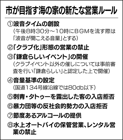 海水浴場の「健全化」を巡っては、藤沢市が昨年から片瀬西浜海岸で音楽を全面的に禁止、逗子市も音楽の禁止や飲酒、刺青の規制を盛り込んだ条例案を議会で審議している。鎌倉市が罰則などのない「理念条例」としたことで、市議会でも実効性を疑問視する意見が出されている。市は「行政、事業者、利用者、地域住民が一丸となって安全で快適な海水浴場を実現したい」としている。