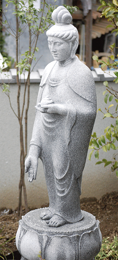 人々を救うために半歩踏み出した左足、差し伸べた右手は柔らかな丸みを帯びた薬王菩薩像。大埜住職は「もともとお寺は人々にとって癒しの場だった。この像も辛いことがあった時など、触れることで少しでも心が和むような存在になれば」と話している。