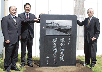 石碑は高さ1・5メートル、幅1メートルの黒御影石造りで、表面中央には在りし日の「鎌倉海濱ホテル」が、裏には両施設の歴史が刻まれた。