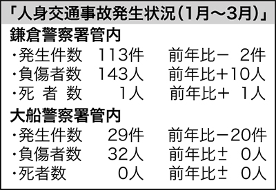 これは県内の交通事故死者数が4月13日現在、52人で前年比8人増の全国ワースト2位、特に4月に入って13人で全国最悪となったことをうけたもの。同日までに2人以上の交通事故死者が発生した地域が指定された。市内では鎌倉署管内で1月に歩行者を避けようとした運転手が亡くなるバイク事故が、大船署管内で4月に歩行者が亡くなるバイク事故が起きている。