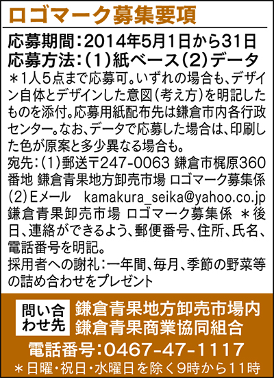 今後は「地産他消」を目指し、他地域にも販路を拡大していく考えだ。「ロゴマークを多くの鎌倉市民に知ってもらい、ゆくゆくはそれを目印に観光客のお土産に選ばれるようになれば」と須田さん。ネット販売も視野に入れているという。ロゴマーク募集の詳細・問い合わせは左表へ。