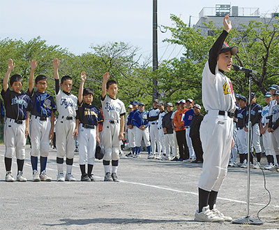 湘南エリアで活動する少年野球チームが練習の成果を発揮する「第8回湘南リーグ親善少年野球大会」の開会式が5月10日、市内上町屋の三菱電機グランドで行われた。
