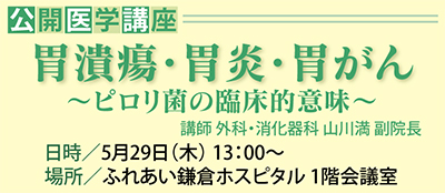 地域密着の医療を掲げる御成町の「ふれあい鎌倉ホスピタル」。同院では、参加無料の市民向け公開医学講座を定期開催している。5月29日(木)は外科・消化器科の山川満副院長が「胃潰瘍・胃炎・胃がん」をテーマに講演を行う。