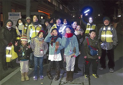 期間中は厳しい寒さのなか、1歳から小学5年生までの子ども28人を含む、延べ82人が参加。子どもたちが中心となり「パトロール中」と声をかけながら拍子木を打ち鳴らし、ブルーライトを振りながら区域内を巡回し、公園や駐車場、暗がり、防犯灯の設置具合などもチェックした。同様のパトロールは中高年の参加者が多く、多世代の住民が参加するのは市内でも珍しいという。
