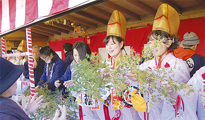 厄を除け福を呼び、商売繁盛をもたらすとされる七福神の「えびす様」を祭る同寺。境内にある鳳凰竹から作られた福笹を参拝者が購入すると、地元から選ばれた福娘らが音頭に合わせ「商売繁盛、家内安全、お祈り申し上げまーす」などと声を上げた。