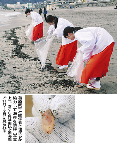 市内梶原の葛原岡神社(長岡仁志宮司)の神職・巫女らは3月3日、近隣住民とともに由比ヶ浜海岸を清掃した。これは、同社で取り扱う縁結びのお守りに同海岸のさくら貝を使用していることから行われたもの。近年、同海岸で採れるさくら貝は減少傾向にあり、関係者は「きれいな海岸を取り戻し、恩返しをしたい」と話している。