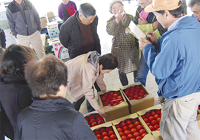 競りを取り仕切る須田誠一郎さんは「今日は関谷産の朝採れトマトが入った。良い値が付きましたよ」と笑顔で話した。