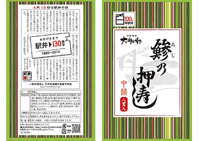 (株)大船軒は駅弁誕生130周年を記念し、「伝承鯵の押寿し」(1250円)と「鯵の押寿し」(960円)の記念パッケージバージョンを販売している。
