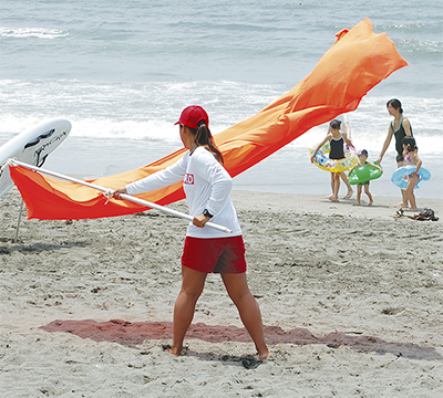 また、津波の到来を知らせるサインとして鎌倉マリンスポーツ連盟が考案し、全国各地で使用が広がっている「オレンジフラッグ」が監視所などに掲出された。砂浜ではライフガードがオレンジの旗を振って危険を知らせ、来場者を海水浴場の出口へと誘導した。
