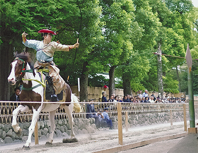鎌倉武士さながらの狩装束を身に着けた射手が特設された約250mの馬場を疾走。馬上から3つの的をめがけ、弓を引いた。