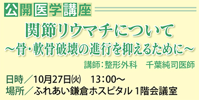「地域密着の医療」を掲げる御成町のふれあい鎌倉ホスピタルは、市民を対象とした公開医学講座を定期開催している。10月27日(火)は「関節リウマチについて〜骨・軟骨破壊の進行を抑えるために」をテーマに東京女子医科大学教授で整形外科の千葉純司医師が講演を行う。