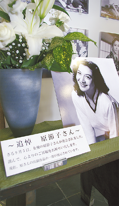 鎌倉市川喜多映画記念館は、入口に原さんの写真とカサブランカの花を飾り、追悼コーナーを設けた。同館の馬場祐輔さんは「ささやかですが追悼の意を示したかった」と話す。