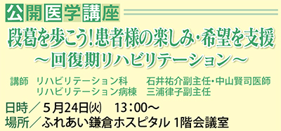 「地域密着の医療」を掲げる御成町のふれあい鎌倉ホスピタルでは、無料の公開医学講座を定期開催している。5月24日(火)はリハビリテーション科の中山賢司医師と石井祐介さん、リハビリテーション病棟の三浦律子さんの3人が「段葛を歩こう!患者様の楽しみ・希望を支援〜回復期リハビリテーション」をテーマに講演を行う。