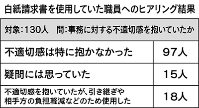 委員会のヒアリングに対し、白紙請求書の使用を認識していた職員130人のうち約75%にあたる97人が「不適切感は特に抱かなかった」と答えており、「問題意識の欠如」が改めて浮き彫りとなった。