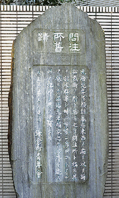 「問注所」とは鎌倉幕府の訴訟機関で、現在、御成小学校前にその跡の石碑がある(実際にこの場所に問注所があったという事は確かではない。はじめは大倉の源頼朝邸内にあった)。